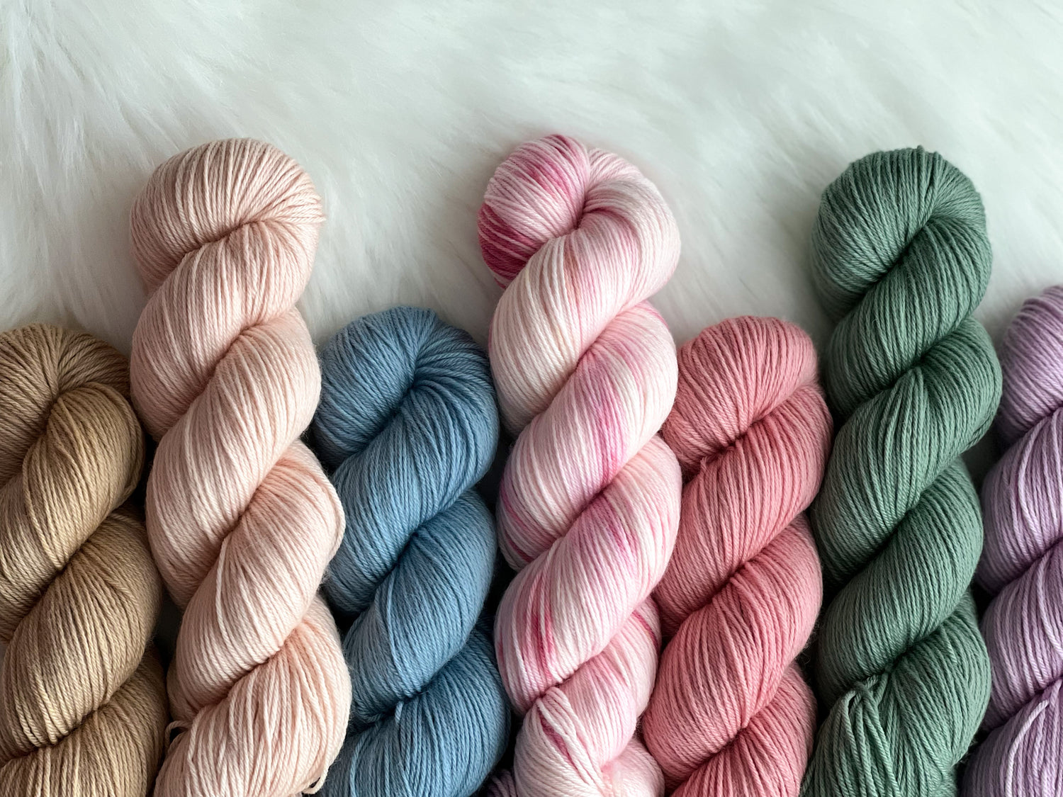 Our yarn is all hand-dyed in our small studio in California. We release our yarn in limited collections, so once a colorway is gone, it's gone for good (unless we decide to bring one back due to popular demand). Each and every skein that leaves our studio goes through a thorough quality check to ensure that they are up to our high standards.